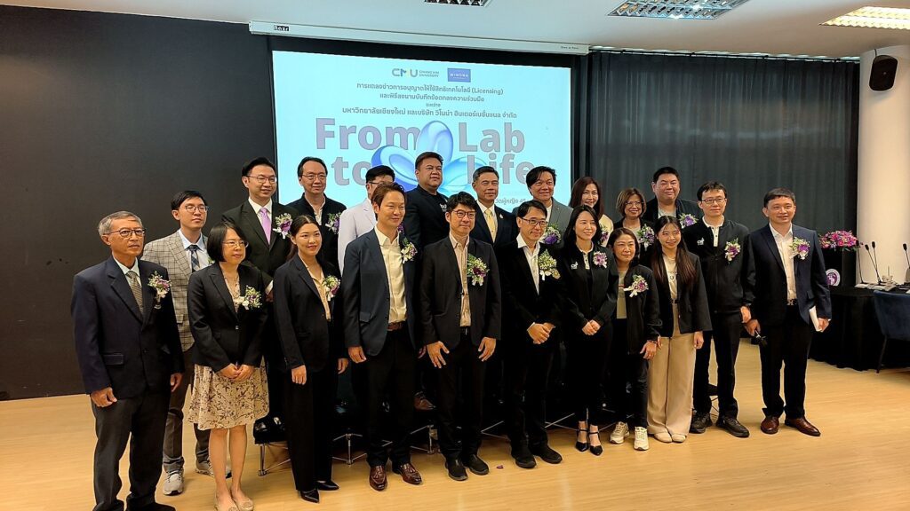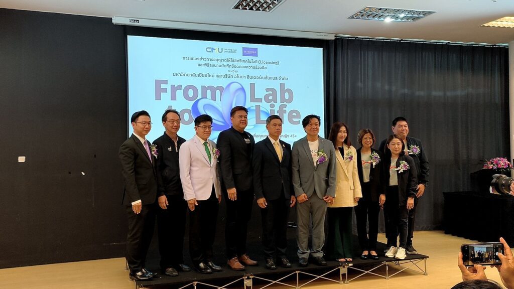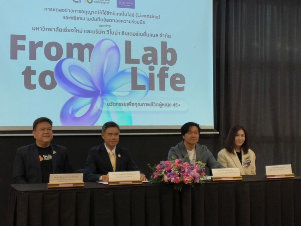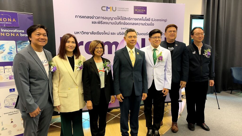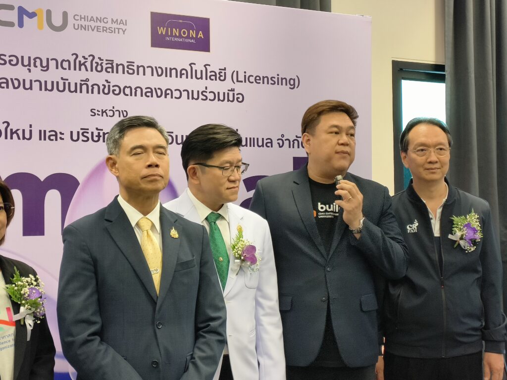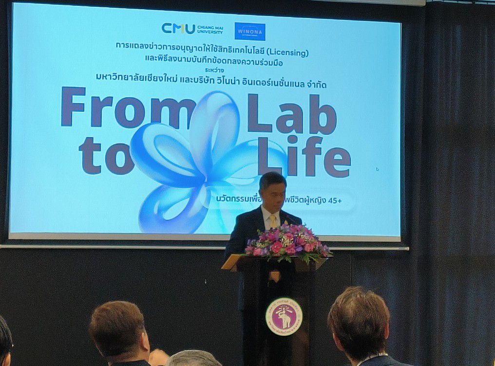 เชียงใหม่ 1 ก.ย.- มหาวิทยาลัยเชียงใหม่ (มช.) ได้จัดแถลงข่าวการอนุญาตให้ใช้สิทธิเทคโนโลยี (Lensing) ผลิตภัณฑ์สารสกัดถั่วเหลืองในรูปแบบชนิดเม็ดแคปซูล อาหารเสริมและรูปแบบทาภายนอก ซึ่งเป็นนวัตกรรมเพื่อคุณภาพชีวิตผู้หญิง 45+ ให้แก่บริษัท วิโนน่า อินเตอร์เนชันแนล จำกัด พร้อมลงนามบันทึกข้อตกลงความร่วมมือ (MOU) กับบริษัทฯ โดยมีเป้าหมายเพื่อยกระดับการวิจัยและพัฒนานวัตกรรมด้านสุขภาพให้สามารถนำไปใช้ประโยชน์ได้จริงในภาคอุตสาหกรรมและสังคม ณ อาคารอำนวยการอุทยานวิทยาศาสตร์ภูมิภาค ภาคเหนือ ตำบลสุเทพ อำเภอเมืองเชียงใหม่ จังหวัดเชียงใหม่โดยมีศาสตราจารย์ ดร.นพ.พงษ์รักษ์ ศรีบัณฑิตมงคล อธิการบดี มช. เปิดงานพร้อมลงนามความร่วมมือกับ นายอิทธิพล ศรีอิทยาจิต กรรมการบริษัท วิโนนา อินเตอร์เนชั่นแนล จำกัด มีจุดมุ่งหมายเพื่อส่งเสริมการวิจัยและพัฒนาเทคโนโลยีที่ตอบโจทย์การเปลี่ยนแปลงของสังคมไทยในอนาคตโดยเฉพาะสุขภาพที่ดีในกลุ่มประชากรสตรีวัยทอง หรือ 45 + และผู้สูงอายุที่กำลังเป็นสังคมภาพรวมของประเทศเวลานี้ รวมถึงการสร้างโอกาสให้กับบุคลากรของมหาวิทยาลัยสามารถพัฒนาทักษะและต่อยอดองค์ความรู้ ผ่านการทำงานร่วมกับภาคเอกชน พร้อมส่งเสริมนักศึกษาผ่านกิจกรรมสหกิจศึกษาเน้นการเรียนรู้จากประสบการณ์ตรง เพื่อเตรียมความพร้อมสู่การทำงานอย่างมีประสิทธิภาพให้ความสำคัญกับบทบาทการเป็นฟันเฟืองในการพัฒนาประเทศด้วยนวัตกรรม พร้อมสนับสนุนการทำงานของบุคลากรตั้งแต่งานวิจัยขั้นพื้นฐานจนกระทั่งพร้อมส่งต่อไปยังภาคเอกชน เพื่อรับไม้ต่อการใช้ประโยชน์เชิงพาณิชย์ต่อไป