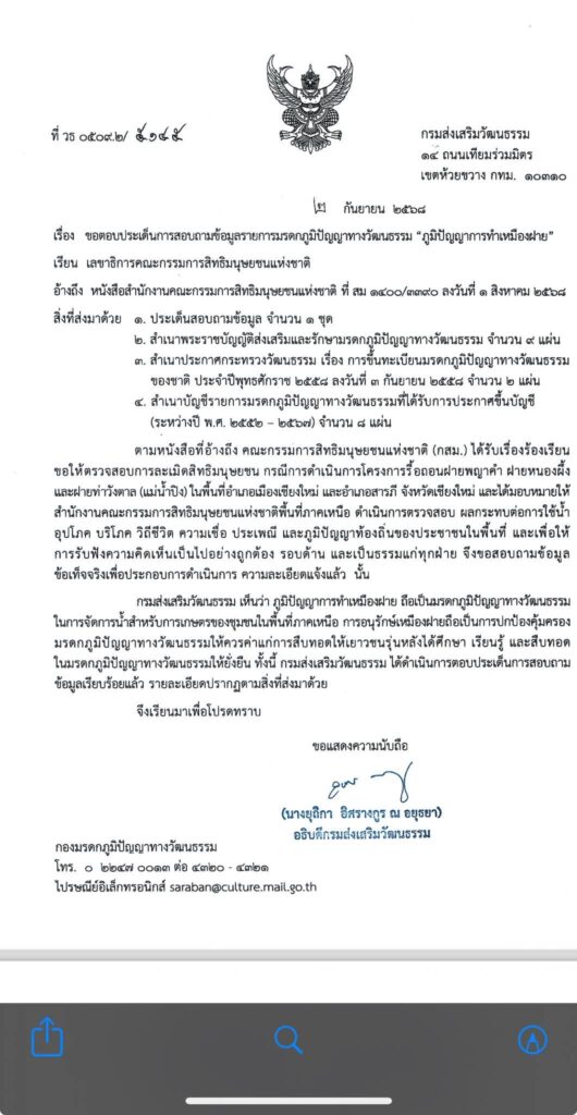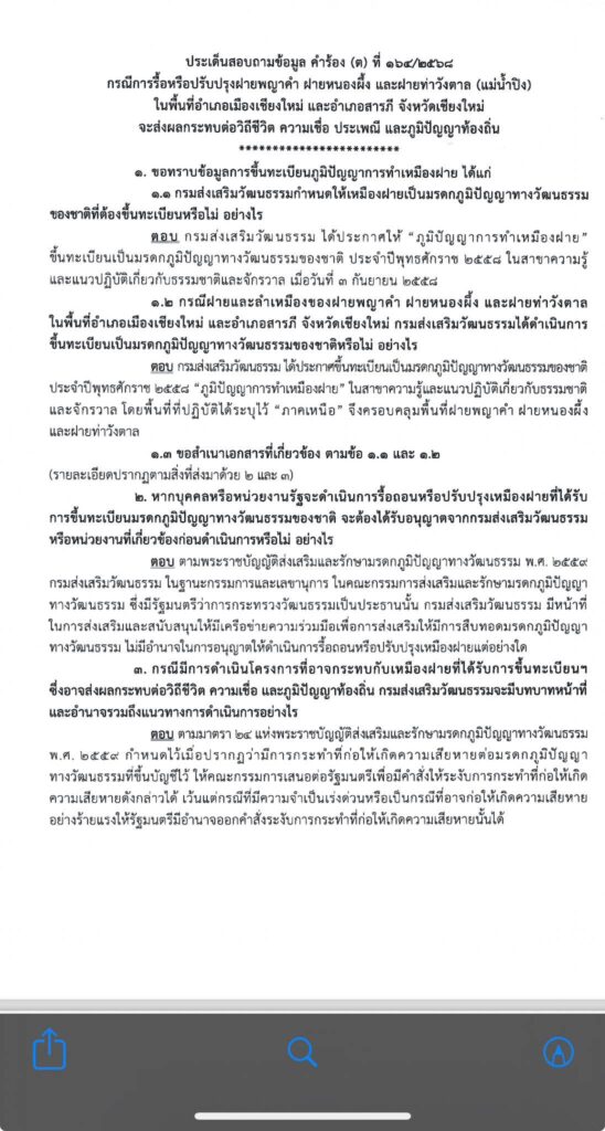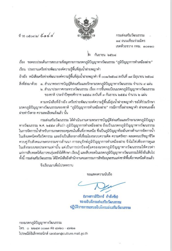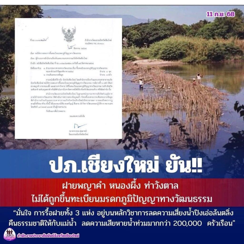 เดือด! นักอนุรักษ์ทำจดหมายเปิดผนึกถึงกรมส่งเสริมวัฒนธรรม กระทรวงวัฒนธรรมกรณีที่ปภ.เชียงใหม่ ยันว่า ฝายเก่าแก่“ฝายพญาคำ ฝายหนองผึ้ง ฝายท่าวังตาล ไม่ได้ถูกขึ้นทะเบียนเป็นมรดกภูมิปัญญา“เป็นการให้ข้อมูลที่เป็นเท็จ!