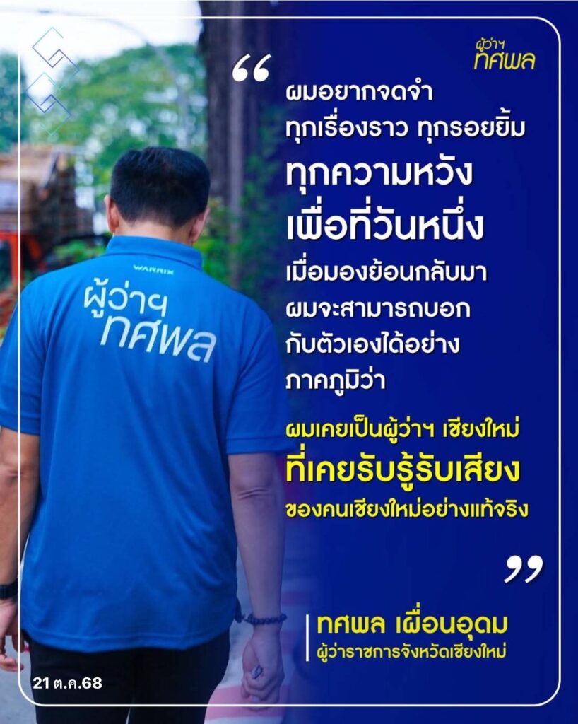 ทั้งนี้ผู้ว่าราชการจังหวัดเชียงใหม่ได้มีการทำงานและให้ข้อมูลกับประชาชนผ่าน social ทุกวันจนเป็นที่ถูกใจของชาวบ้านที่ได้เห็นการลงพื้นที่ทำงานและล่าสุดวันนี้(21 ต.ค.)นายทศพลก็ได้โพสต์ผ่าน facebook ตัวเองอีกครั้งโดยระบุว่า ณ.เวลาที่เหลืออีกไม่นานนี้ ที่ผมจะได้ปฏิบัติหน้าที่ในตำแหน่ง “ผู้ว่าราชการจังหวัดเชียงใหม่” ผมตั้งใจจะใช้ทุกวันอย่างมีคุณค่า เดินทางไปยังทุกอำเภอ เพื่อรับฟังปัญหา