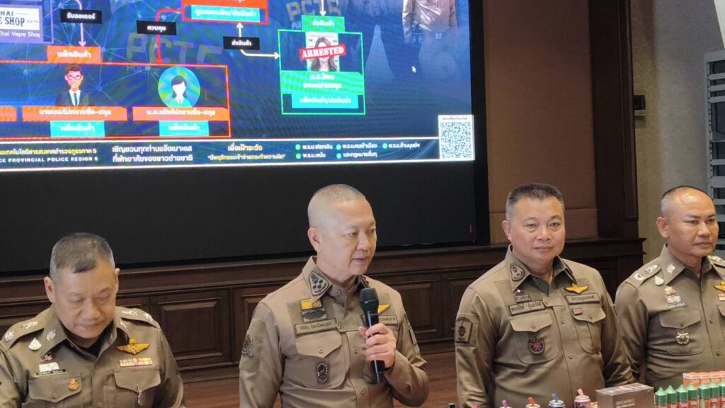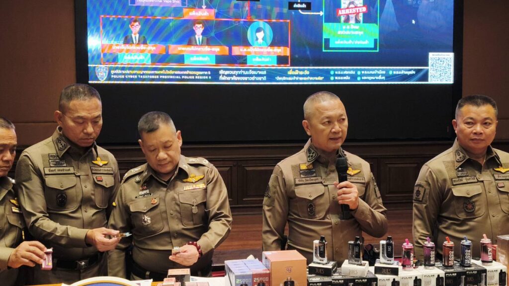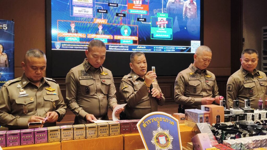 เชียงใหม่ 28 ต.ค.- ที่กองบัญชาการตำรวจภูธรภาค 5 อำเภอเมืองจังหวัดเชียงใหม่ มีการแถลงข่าวผลการปฏิบัติการบุกค้นรังจำหน่ายบุหรี่ไฟฟ้าออนไลน์ เครือข่าย “VAPEHAUS” 3 จุด กลางเมืองเชียงใหม่ รวบ 2 ผู้ต้องหา พร้อมของกลางบุหรี่ไฟฟ้า 36,555 ชิ้น มูลค่ากว่า 6.6 ล้านบาท เตรียมขยายผลจับนายทุนต่อ โดยมี พล.ต.อ.ธัชชัย ปิตะนีละบุตร รอง ผบ.ตร.เป็นประธาน ตามนโยบายของรัฐบาลโดย นายอนุทิน ชาญวีรกูล นายกรัฐมนตรี ได้สั่งการให้ยกระดับเรื่องการปราบปรามอาชญากรรมทางเทคโนโลยีเป็นวาระแห่งชาติ ตำรวจภูธรภาค 5 ได้สั่งการให้ทุกหน่วยในสังกัดให้ดำเนินการปราบปรามอย่างเข้มข้นในทุกมิติทันที ซึ่งในกรณีดังกล่าว ทางศูนย์ปราบปรามอาชญากรรมเทคโนโลยีสารสนเทศ ตำรวจภูธรภาค 5 (ศปอส.ภ.5) ร่วมกับ บก.สส.ภ.5 ทำการสืบสวนจนทราบว่า มีกลุ่มบุคคลที่ลักลอบจำหน่ายบุหรี่ไฟฟ้าผ่านระบบอินเตอร์เน็ตเว็บไซต์ ชื่อ “vapehaus URL: https://vapehaus.net”
