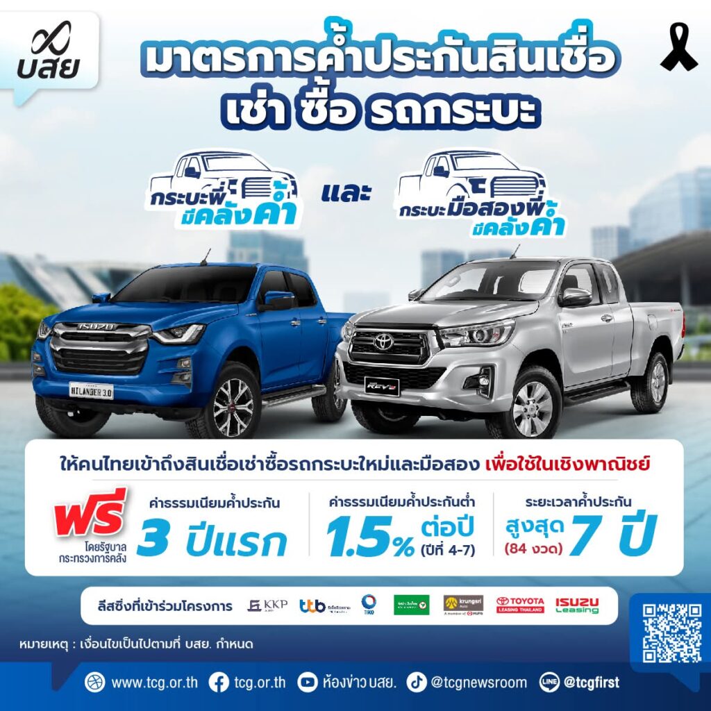 นอกจากนี้ ยังมีโครงการค้ำประกันสินเชื่อเช่าซื้อ “บสย. SMEs PICK-UP” ภายใต้มาตรการ “กระบะพี่ มีคลังค้ำ” ช่วย SMEs ที่ต้องการชื้อรถกระบะใหม่ เพื่อประกอบอาชีพ ฟรี! ค่าธรรมเนียม 3 ปี พร้อมค้ำประกันสูงสุด 7 ปี โดย บสย. ค้ำประกันสินเชื่อเช่าซื้อ ผ่านสถาบันการเงินและกลุ่มลีสซิ่งของบริษัทรถยนต์ รวม 7 แห่ง ได้แก่ ธนาคารเกียรตินาคินภัทร, ธนาคารทหารไทยธนชาต, ธนาคารทิสโก้, ลีสซิ่งกสิกรไทย, กรุงศรี ออโต้, โตโยต้า ลีสซิ่ง และ ตรีเพชรอีซูซุลิสซิ่ง สำหรับผู้ประกอบการ SMEs ที่ต้องการซื้อรถกระบะเพื่อประกอบอาชีพ สามารถติดต่อที่โชว์รูมรถยนต์ใกล้บ้าน และยื่นขอสินเชื่อกับลีสซิ่ง และสถาบันการเงินที่ร่วมมาตรการ “กระบะพี่ มีคลังค้ำ” หรือ ลงทะเบียนเข้าร่วมมาตรการฯ ได้ที่ LINE OA : @tcgfirst ฟรี! ไม่มีค่าใช้จ่าย